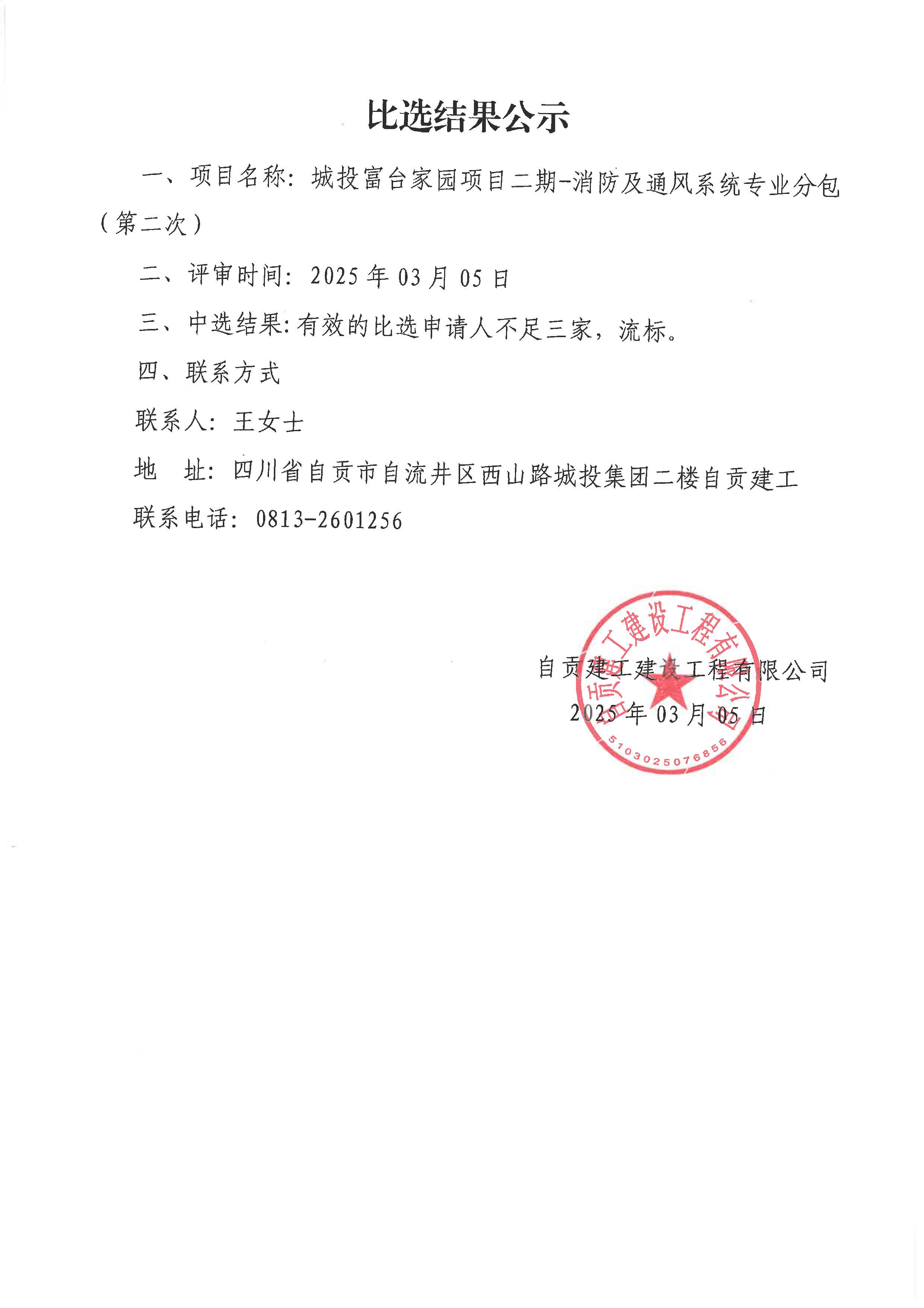城投富台家园项目二期-消防及通风系统专业分包(第二次)比选结果公示